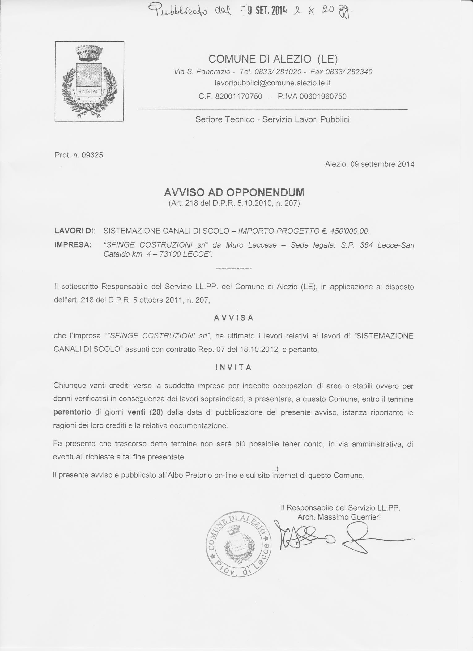 AVVISO AD OPPONENDUM - Lavori di "Sistemazione canali di scolo"