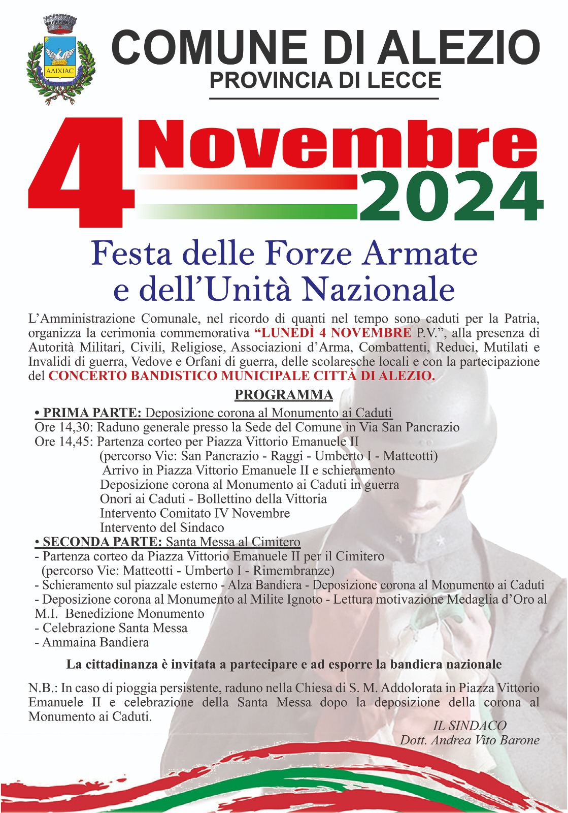 L'Amministrazione Comunale, nel ricordo di quanti nel tempo sono caduti per la Patria, organizza la cerimonia commemorativa "LUNEDì 4 NOVEMBRE P.V.", alla presenza di Autorità Militari, Civili, Religiose, Associazioni d'Arma, Combattenti, Reduci, Mutilati e Invalidi di guerra, delle scolaresche locali e con la partecipazione del Concerto Bandistico Municipale di Alezio.
