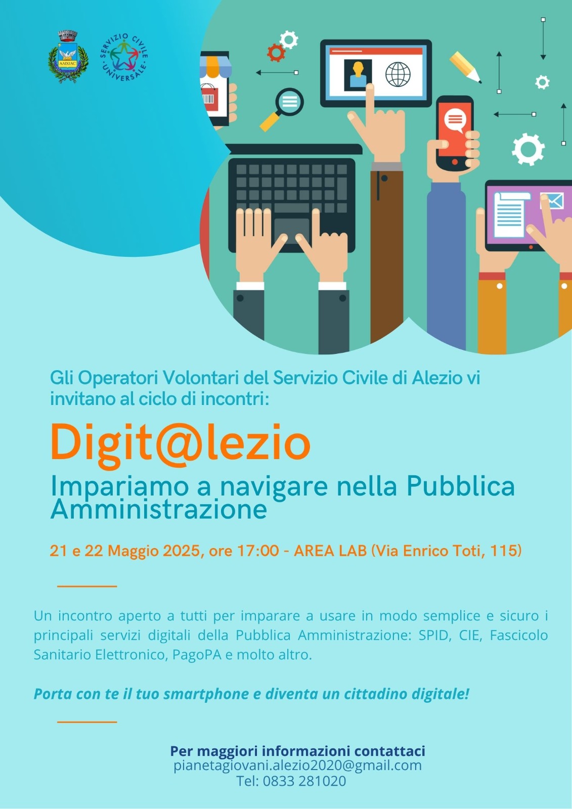 Si comunica che mercoledì 21 maggio 2025 alle ore 17:00 e giovedì 22 maggio 2025 alle ore 17:00, presso l’AREA LAB (Via Enrico Toti, 115) si terrà il laboratorio di cittadinanza digitale di programma organizzato dai ragazzi del Servizio Civile Universale del progetto “Pianeta Giovani 2023” che verterà sull’utilizzo delle principali piattaforme che la Pubblica Amministrazione mette a disposizione del cittadino per una maggiore facilitazione dei servizi.